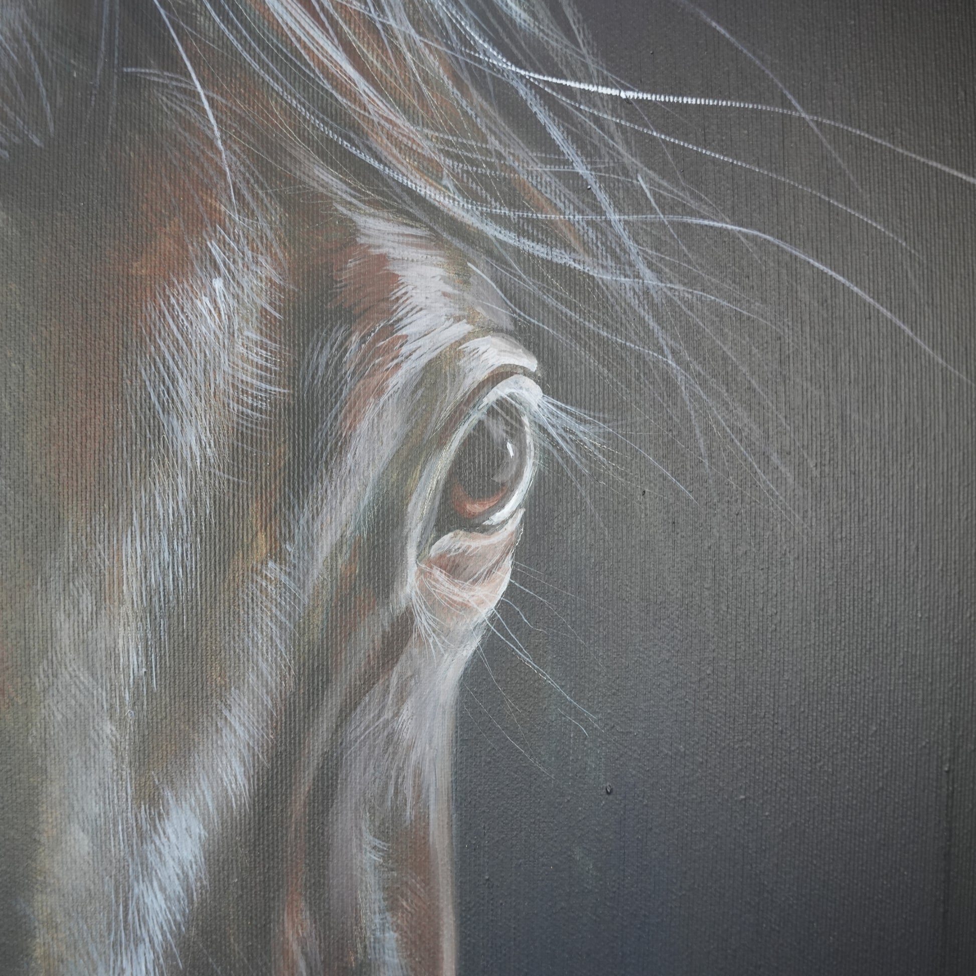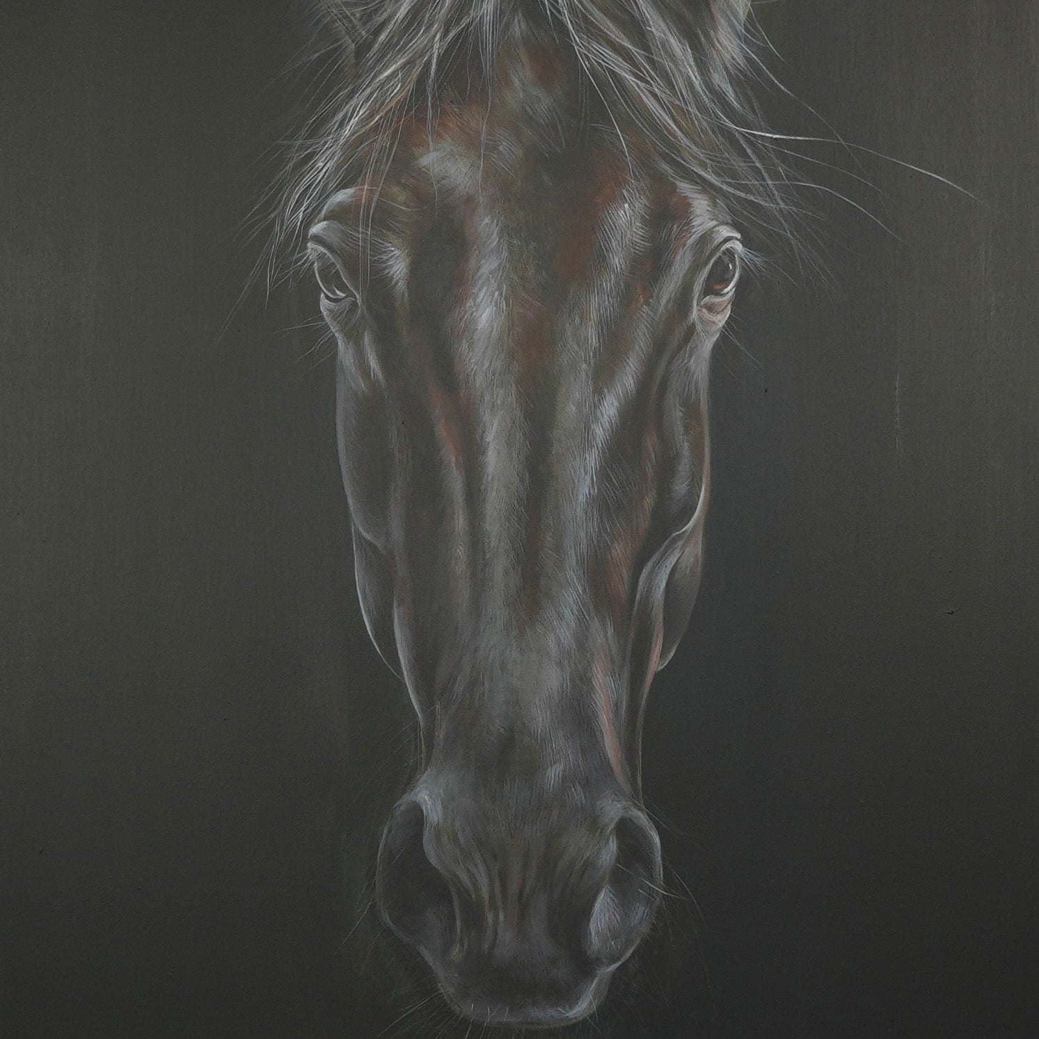 Dieses eindrucksvolle Pferdeporträt besticht durch seine intensive Präsenz und die stille Kraft des Blicks. Vor einem tiefdunklen, nahezu schwarzen Hintergrund tritt der Pferdekopf wie aus dem Schatten hervor – fein modelliert mit sanften Lichtreflexen, die Stirn, Nüstern und die seidige Mähne plastisch hervorheben. Die reduzierte Farbpalette und die präzise Ausarbeitung der Details lassen das Motiv besonders lebendig wirken: jede Strähne, jede Kontur und der ruhige Ausdruck erzählen von Würde, Sensibilität und Stärke.