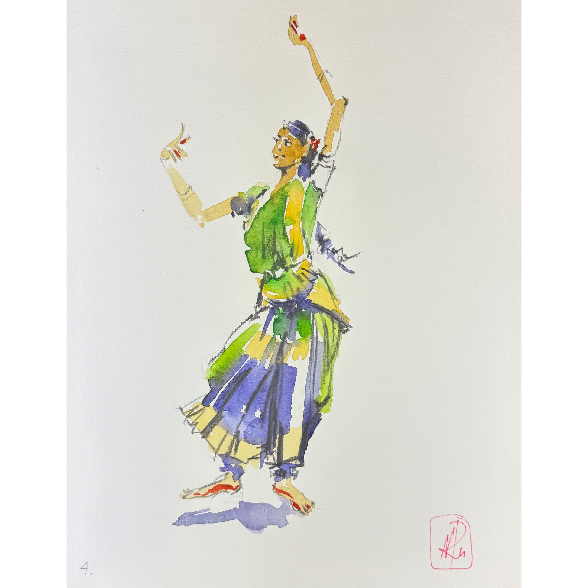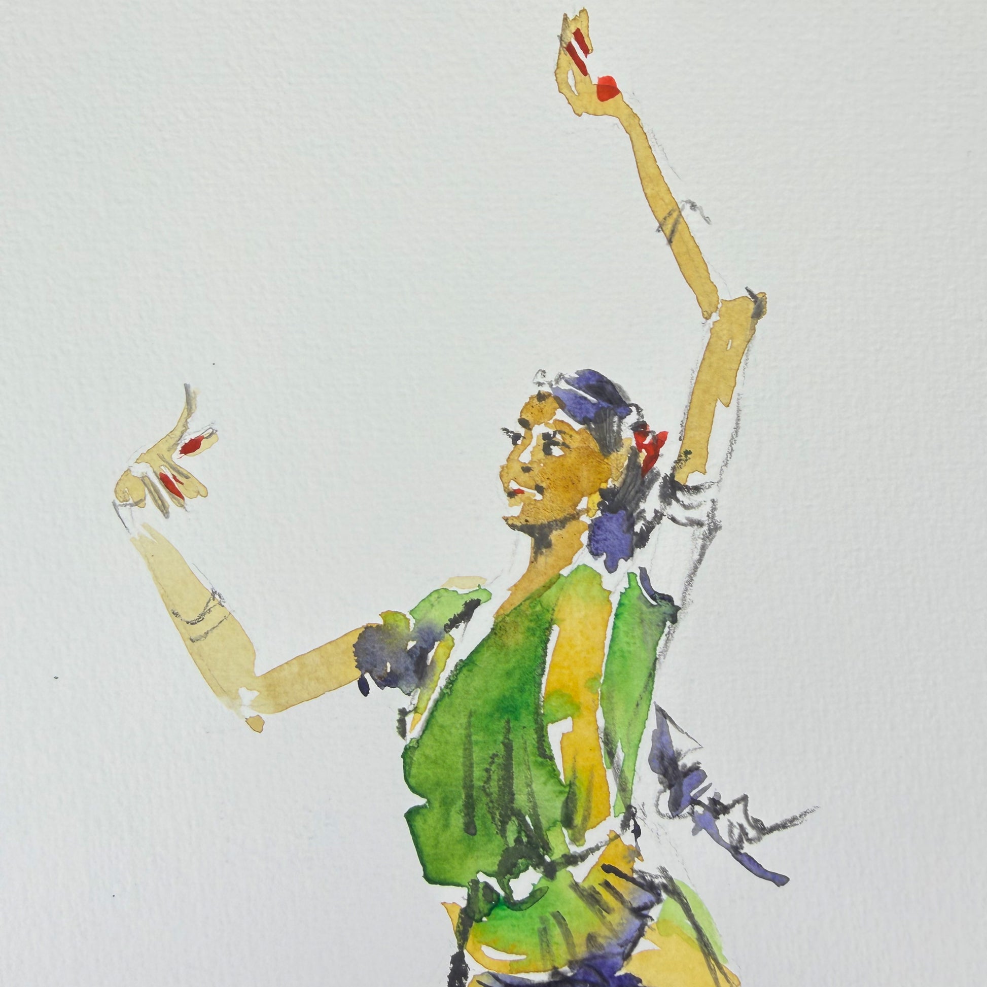„Tänzerin 3“ ist eine leichte, zugleich kraftvolle Aquarellstudie, die die Eleganz einer Tanzpose in klarer Reduktion zeigt. Vor viel Weißraum steht die Figur aufrecht und präsent, die Arme weit geöffnet – eine Geste, die Offenheit, Rhythmus und Bühnenmoment zugleich vermittelt. Frisches Grün und sonniges Gelb bestimmen das Kostüm und treffen auf tiefe Blau- und Violetttöne im Rock, die der Silhouette Ruhe und Gewicht geben. Warme Akzente im Gesicht und an den Füßen setzen kleine Blickpunkte und unterstreichen die Ausdrucksstärke. Die Verbindung aus transparenten Lasuren und skizzenhaften Linien wirkt spontan und zugleich sicher geführt – lebendig, modern und zeitlos.