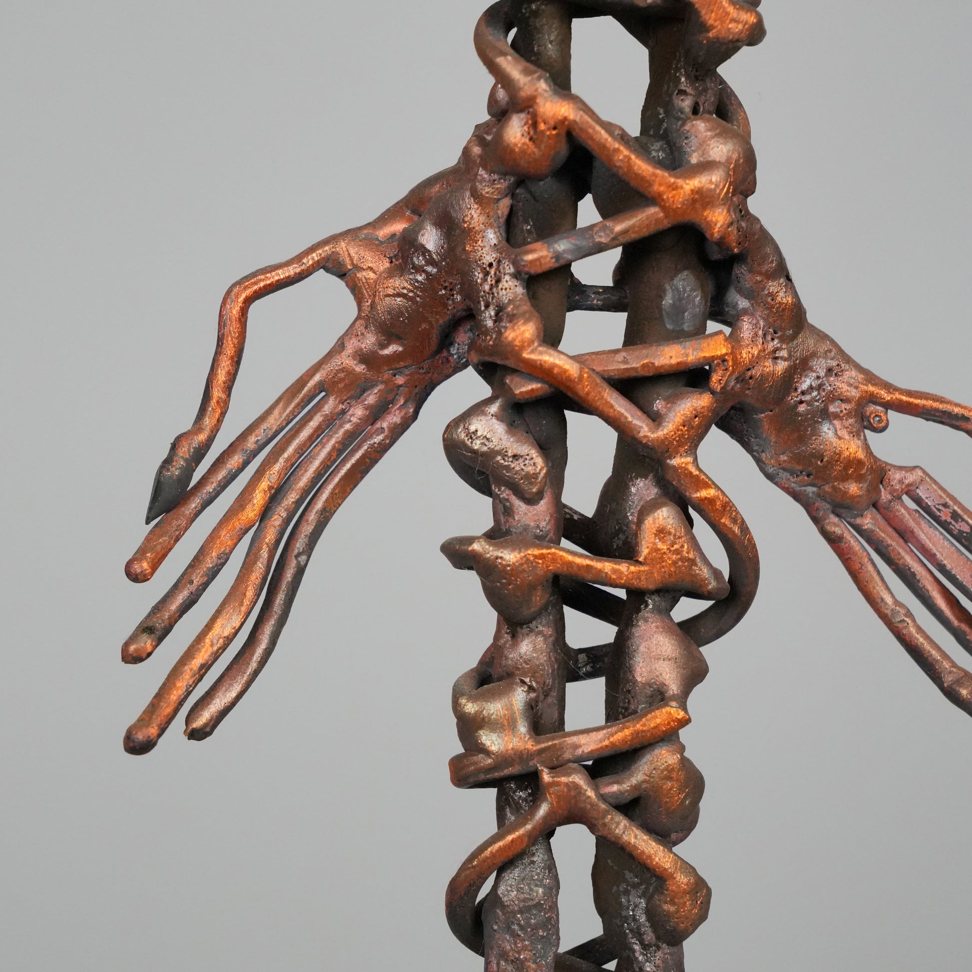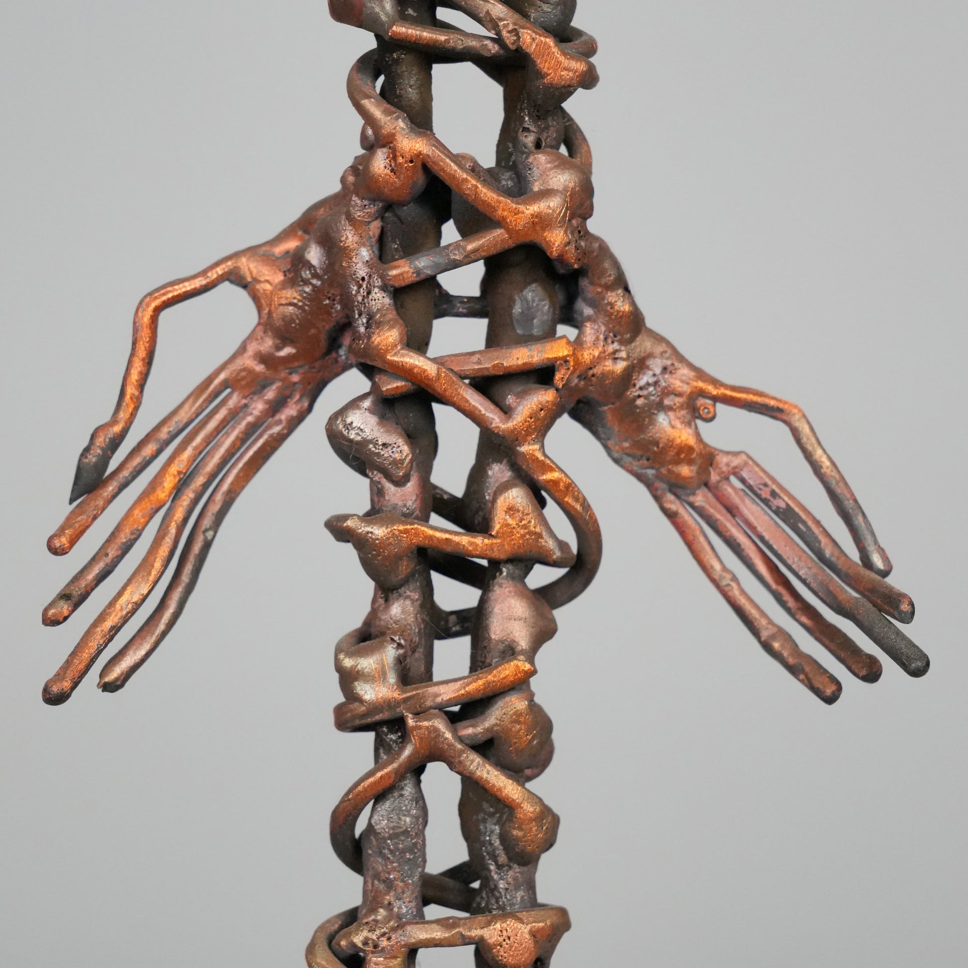 Tatsächlich arbeitet der Munsteraner Künstler Wladimir Rudolf im Spannungsfeld zwischen überzeitlicher Form und innovativer Technik. Dabei entstand seine neue Werkgruppe unter Zuhilfenahme von grobem Werkzeug: Schweißgerät, Hammer und Zange. Rudolf betrachtet sein Objekt durch das schwarze Glas einer Schutzmaske, während er es auf 800 Grad Celsius erhitzt. Dann verflüssigt sich der Kupferdraht und wird formbar. Doch das Material ist eigensinnig, es bleibt immer ein Rest, der sich der Gestaltung entzieht. «Kupfer hat manchmal bessere Ideen als ich selbst», sagt der Künstler und vergleicht die Berücksichtigung der Fließeigenschaften mit der Aquarellmalerei. Die etwa 30 cm großen Skulpturen erhalten indes keinen Pinselstrich, Farbeffekte kommen durch gezielte Oxidation zustande.