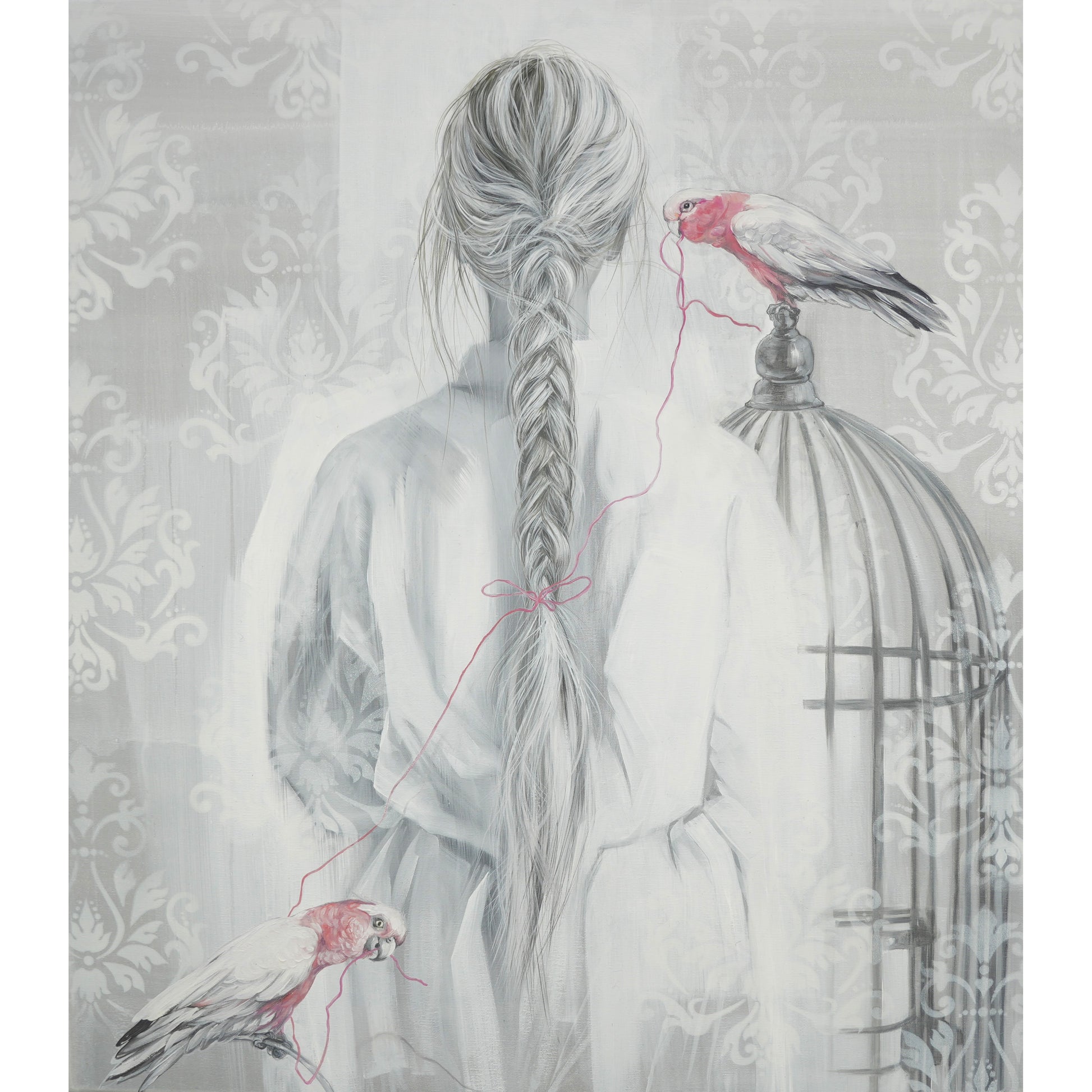 Auf den ersten Blick sehen wir ein Mädchen, das uns den Rücken zuwendet – still, gesammelt, in sich gekehrt. Zwei rosafarbene Papageien begleiten sie, einer erhöht, der andere tiefer positioniert. Zwischen ihnen spannt sich ein feiner roter Faden, der diagonal durch das Bild verläuft – zart, fast unsichtbar, und doch voller Bedeutung.