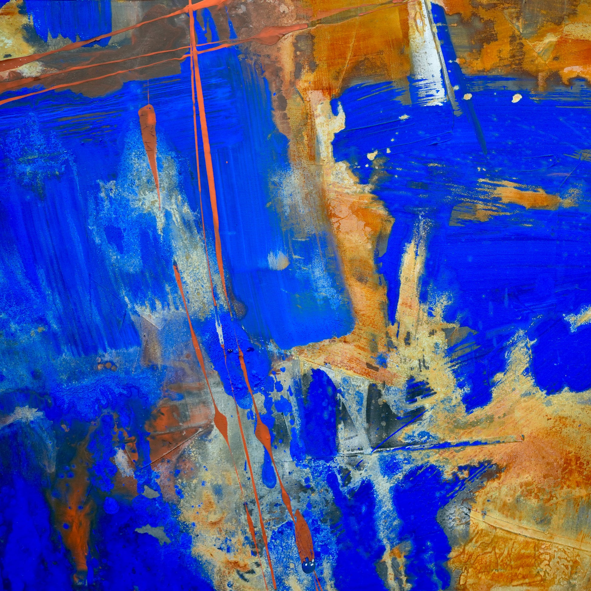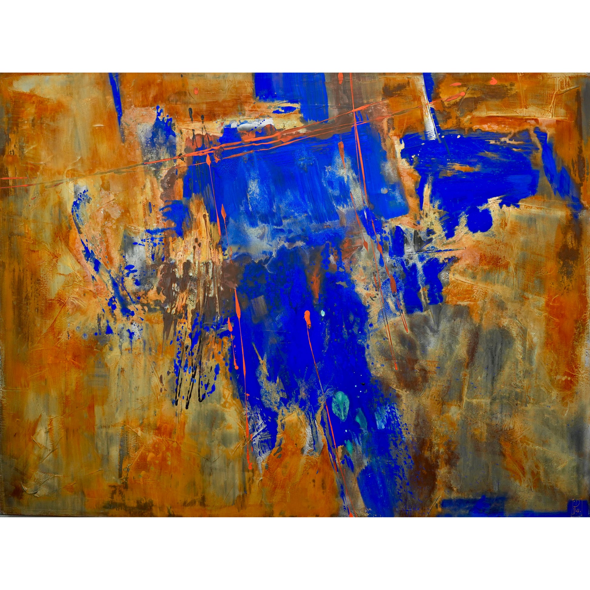 Dieses kraftvolle abstrakte Gemälde fasziniert durch seine dynamische Farbspannung und eine vielschichtige, expressive Oberfläche. Leuchtendes Kobaltblau trifft auf erdige Ocker- und Rosttöne, durchzogen von rauen Strukturen, lasierenden Flächen und energischen Spuren, die dem Werk Tiefe und Bewegung verleihen. Feine Linien, Spritzer und tropfende Akzente in warmen Rot-Orange-Nuancen setzen rhythmische Impulse und lassen die Komposition lebendig wirken – wie ein visueller Dialog zwischen Ordnung und Freiheit, Ruhe und Aufbruch.