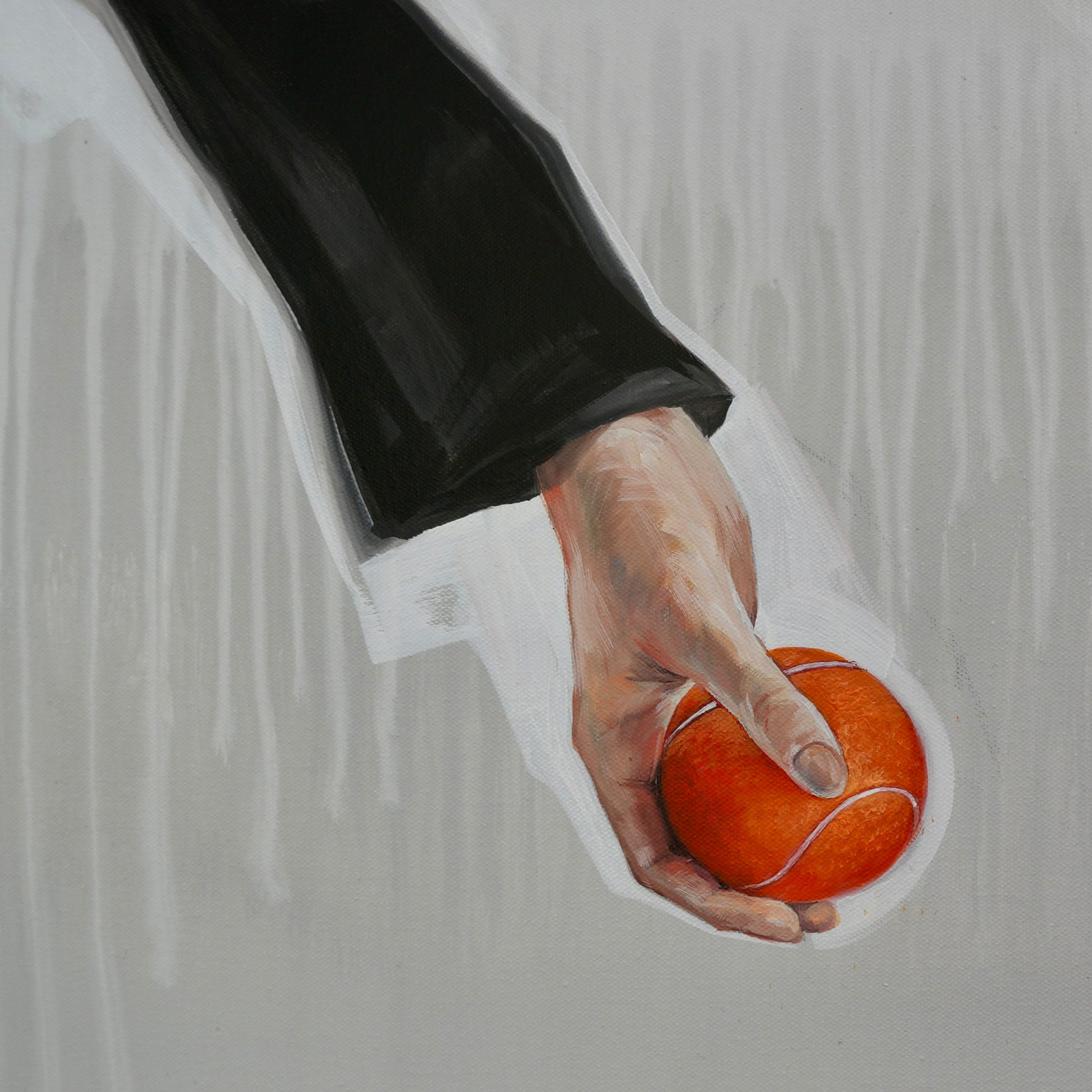 Die reduzierte, kühle Farbpalette in Grau-, Blau- und Weißtönen unterstreicht die stille Stimmung, während feine malerische Übergänge und transparente Schichten in Acryl und Öl den Stoffen Tiefe und Bewegung verleihen. Die Kombination aus detailreicher Darstellung und symbolhaften Elementen lädt dazu ein, über Themen wie Alltag, Vergänglichkeit, Leichtigkeit und Verwandlung nachzudenken.