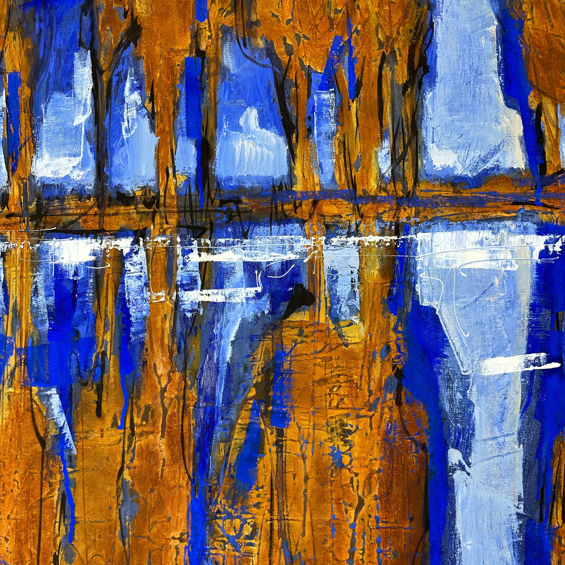 Dieses ausdrucksstarke abstrakte Werk fesselt mit seiner intensiven Farbdramaturgie und einer klaren, spiegelnden Bildstruktur. Sattes Blau trifft auf warme Ocker- und Rosttöne, die wie aufragende Formen an Baumstämme oder eine urbane Silhouette erinnern. Eine horizontale Linie in der Bildmitte wirkt wie ein Ufer oder eine Wasseroberfläche – darunter setzt sich das Motiv als Spiegelung fort und verleiht der Komposition Ruhe, Tiefe und eine fast meditative Symmetrie. Kräftige Pinselspuren, strukturierte Schichten und feine Zeichenspuren sorgen für lebendige Details und eine spannende, haptische Oberfläche.